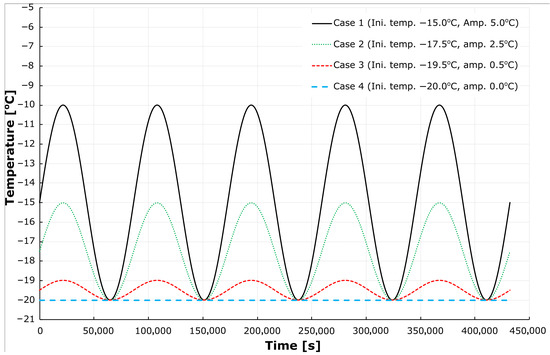 The temperature amplitude on the external surface of the wall was reduced by 40% in cases 1–3 (Figure 7), compared to the air temperature (Figure 4). Furthermore, the average temperature on the external surface of the wall depended on the amplitude of the air temperature and decreased from −9 °C in case 1 (amplitude 5 °C) to −13 °C in case 3 (amplitude 0.5 °C). As illustrated in Case 4, where the amplitude was set to 0 °C, this particular case yielded an asymptotic result indicative of the influence of the amplitude, as well as the minimum temperature, on the surface of the wall (approximately −13.5 °C in Figure 7).