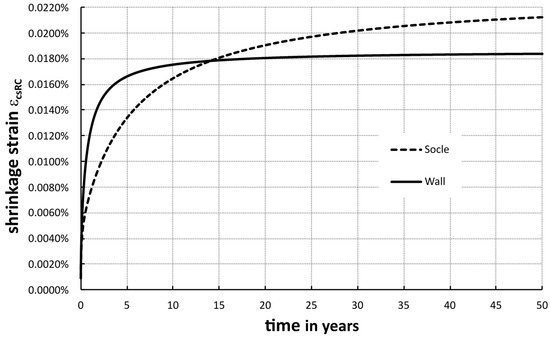 For temperature actions (excluding exposure to sunlight in quasi-permanent load combinations), the following combination coefficients were used: Ψ0 = 0.6, Ψ2 = 0.0–0.70. The values of Ψ0 = 0.6 and Ψ2 = 0.0 are listed in Table A.5 of [7]. However, as outlined in Section 1.2 of this paper, Ψ2 was gradually increased in order to examine its effects. In the SLS, the shrinkage action was neglected because the difference in shrinkage strains in the socle and in the wall after approximately 15 years generates compressive forces in the prestressed wall (Figure 6). Moreover, even temporary filling with water reduces shrinkage. However, in the ULS, the shrinkage action was considered after 616 days, when the maximum difference in shrinkage strains occurs (Figure 6).