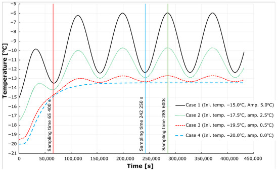 Afterwards, the model was utilised to simulate the temporal temperature distribution in the wall under various air temperature actions, examining the influence of temperature amplitude. The constant water temperature of 25.2 °C and alternating air temperature over a period of 5 days (432,000 s) were assumed. The applied cases of external air temperature followed sinusoidal functions with a period of 24 h (86,400 s), as presented in Table 3 and Figure 4. As the outputs of the analysis were governed by temperature variations and their rate of change, the sinusoidal function was used to represent the model input temperature continuously. This idealised temperature model allows for capturing the essential characteristics of daily temperature fluctuations in the form of a continuous function while ensuring computational stability and repeatability. It also facilitates comparative analysis of thermal responses under cyclic loading and helps identify general trends in transient heat transfer through the tank wall. Furthermore, the assumed external temperature distribution may represent an extreme situation, such as a period of very cold weather lasting a few days in winter. A real example of this is presented in Figure 3.