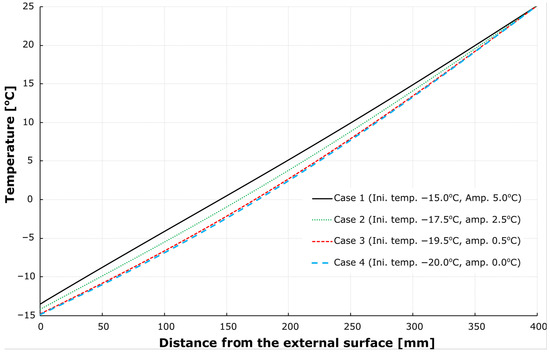 The function of temperature distribution (linear or non-linear) across the wall thickness depended on the time of sampling and the air temperature amplitude (Figure 7, Figure 8 and Figure 9). With a small amplitude (cases 3 and 4) and sampling at the minimum air temperature (Figure 8), the distribution tended to be non-linear and was linearised when the air temperature reached its maximum (Figure 9). The opposite effect was observed when analysing the large-amplitude case 1.