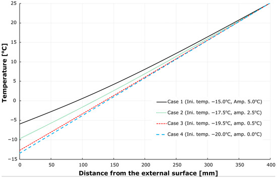 In all cases, a minimum temperature of −20 °C was adopted, with the external surface temperature presented in Figure 2 being referenced, albeit with different temporal scenarios. Additionally, further analyses were carried out with various wall thicknesses (ranging from 300 mm to 600 mm) to assess their influence on the temperature at the outer surface of the wall.