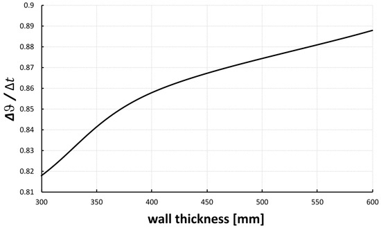 Relative adjusted temperature gradient ∆ϑ across the wall as a function of the wall thickness.