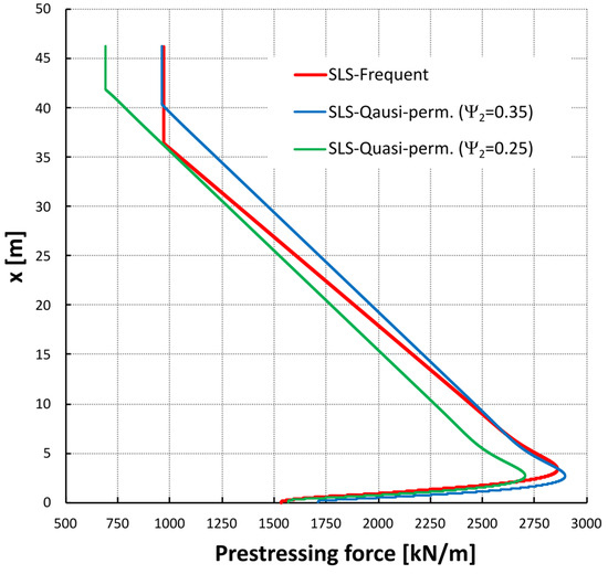 - Depending on the value of Ψ2, in the upper part of the tank (25–30 m in Figure 12), the prestressing force required by the SLS was greater than that required by the ULS, which may lead to over-prestressing; that is, cracks would not occur before failure of the prestressing steel, potentially resulting in sudden collapse. For the value of Ψ2 ≈ 0.70, over-prestressing would occur along the entire height of the tank wall (Figure 12).