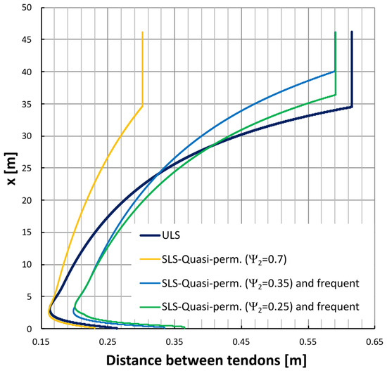 Figure 12. Spacing of prestressing tendons as a result of both summer and winter temperatures, and in SLS additionally as a result of the quasi-permanent and the frequent load combinations.