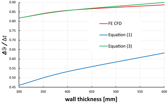 Moreover, the gradient reduction depends on the wall thickness, and it was found that modification of Equation (1) to Equation (3) (with utilisation of the Newton–Rapson procedure to obtain a constant 0.0665 m) well fits (RMSE = 0.0071) the transient analysis results (Figure 13):