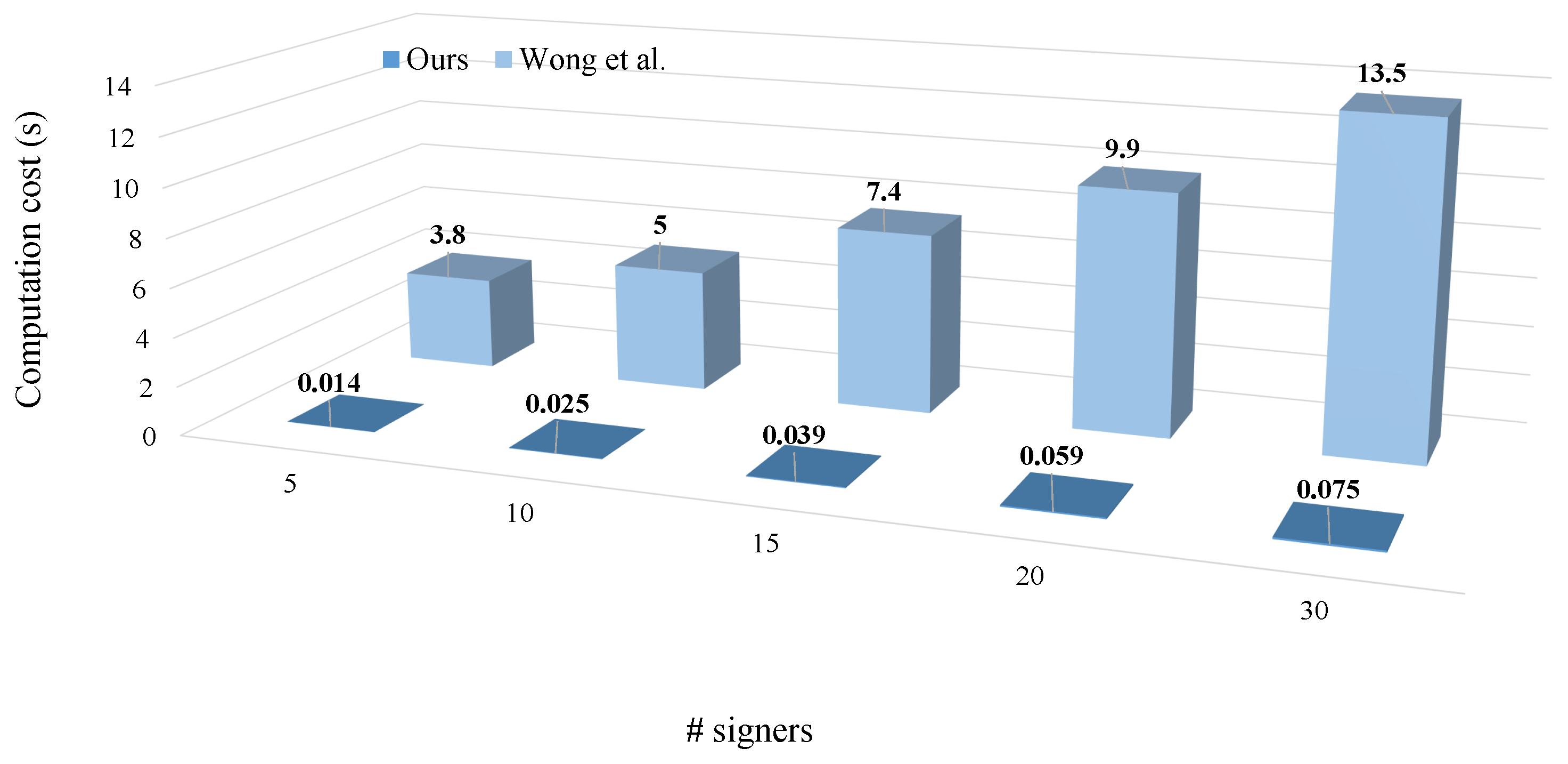 Figure 2 presents the evolution of computation cost as a function of the number of signers for the proposed scheme and the reference model of Wong et al. [