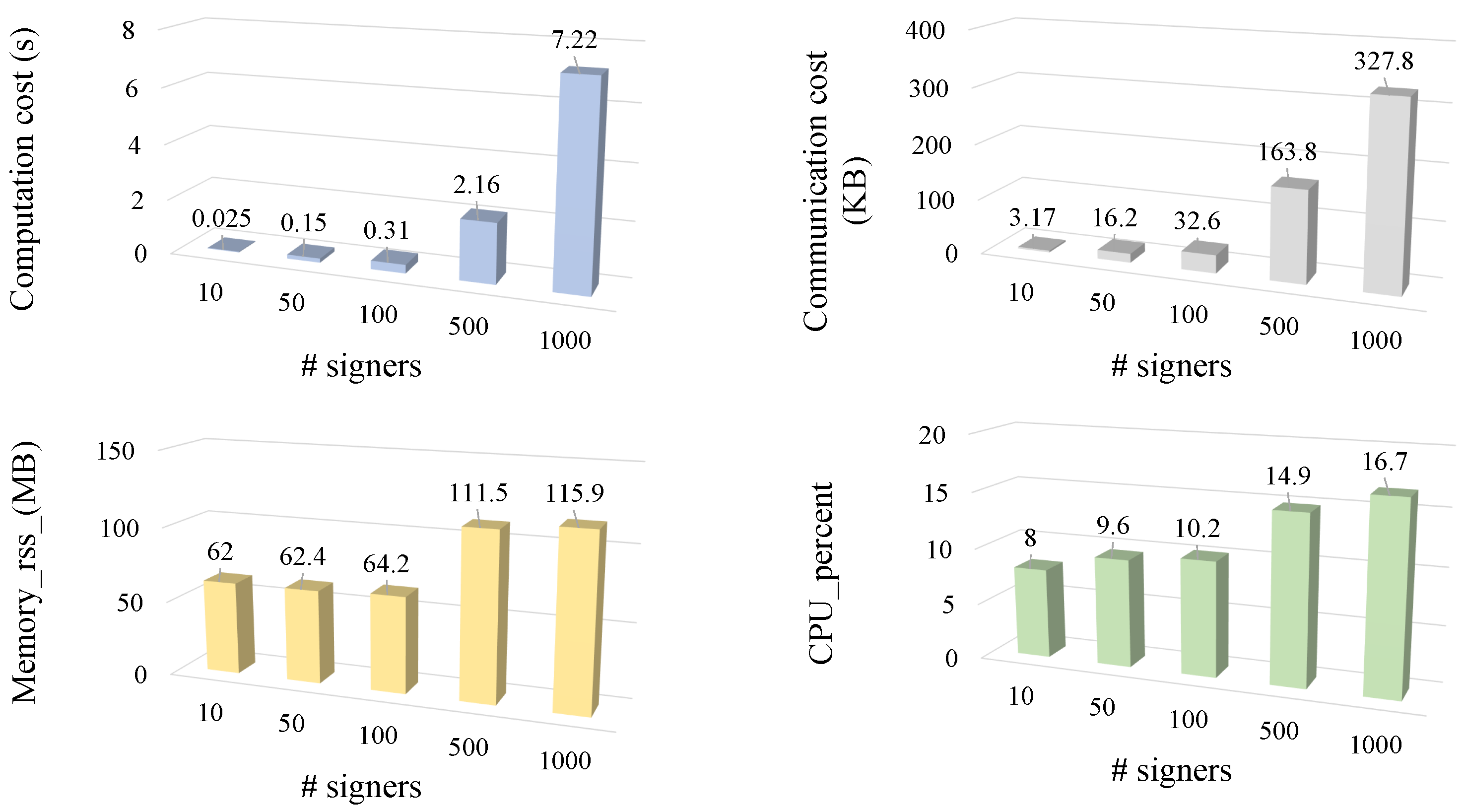 25], our implementation achieves a computation cost of only 0.016 s per aggregation, moderate communication overhead of 14.4 Kbits, and low memory and CPU consumption, validating its suitability for resource-constrained and decentralized environments. The scalability experiments further demonstrate near-linear growth in cost up to 1000 signers, confirming the practicality of the design for large-scale deployments.