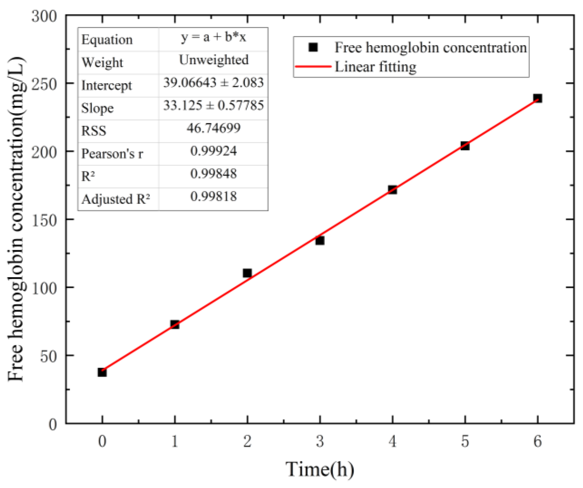 | Plasma free hemoglobin concentration (mg/L) | 37.52 | 50.96 | 88.35 | 113.75 | 148.23 | 201.75 | 226.14 |
