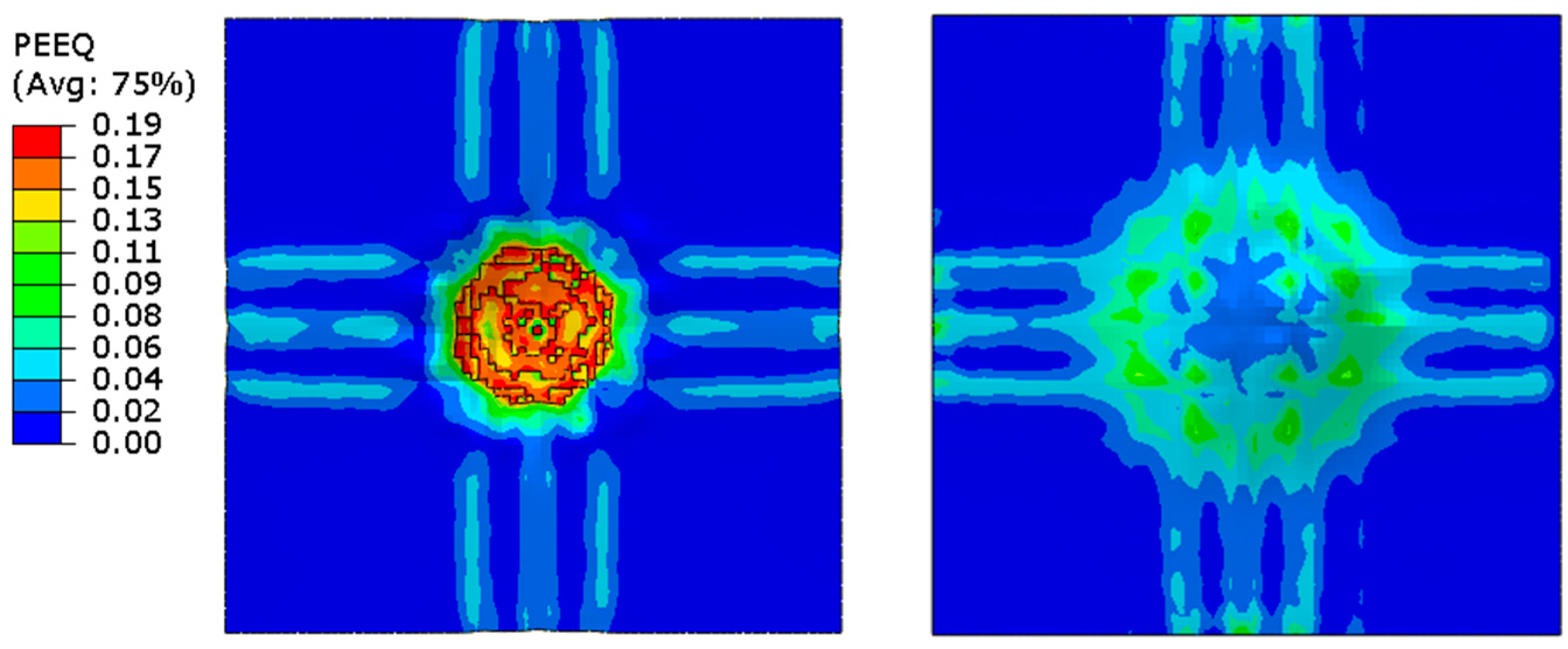 Impact face of the concrete wall using (a) Johnson–Cook, (b) Cowper–Symonds.