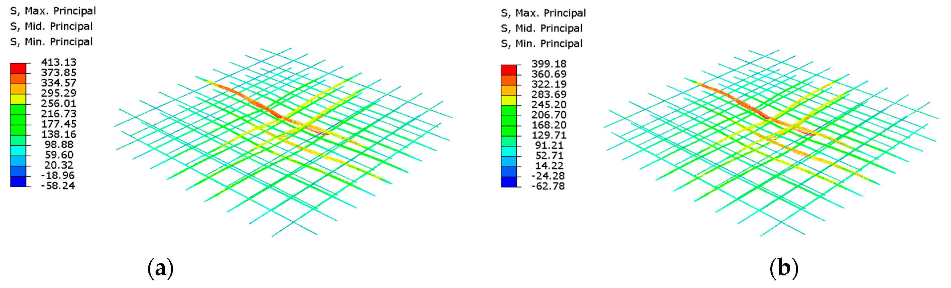 Displacement plot (a) and the Max. Principal stress plot (b) of the reinforcements incorporating the damage models.