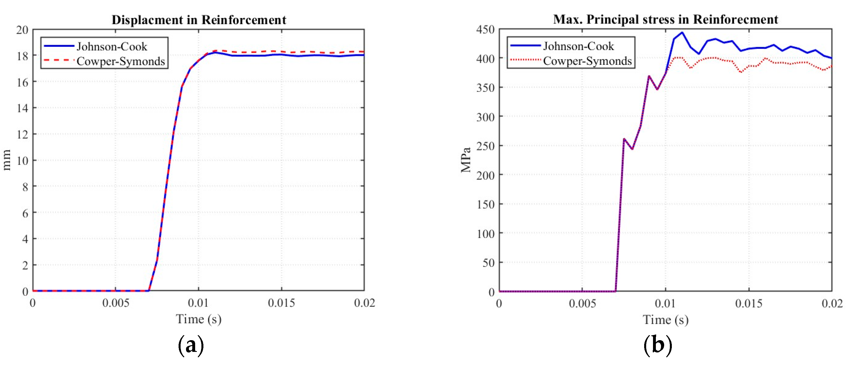 Max. Principal stresses in reinforcement using (a) Johnson–Cook, (b) Cowper–Symonds.