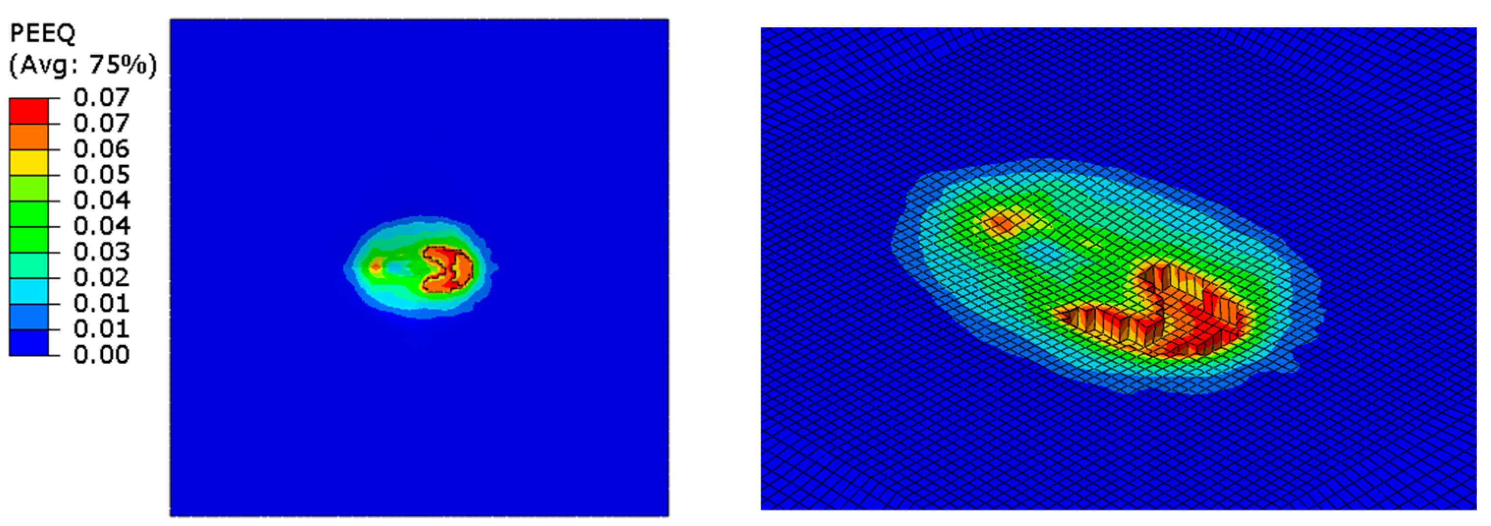 Figure 1. The impactor was modeled as a rigid body where both the slab and the impactor were modeled using a single-point Gauss integration method with viscous hourglass controls, and its representation is shown in