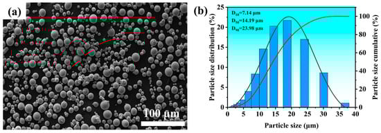 (a) Morphology of Ti65 powders revealed by scanning electron microscopy (SEM); (b) powder size distribution.