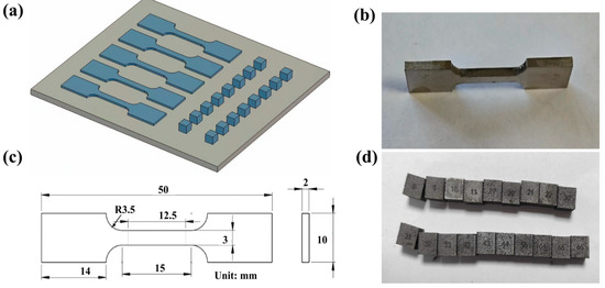 (a) Schematic illustration of the tensile and cubic specimens; (b) macroscopic view of a tensile test specimen; (c) dimensional specifications of the tensile test specimen; (d) macroscopic view of a cube specimen.