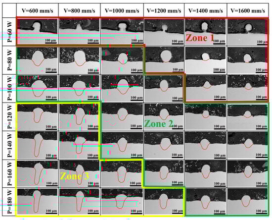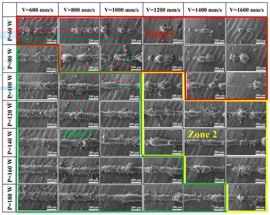 As shown in Figure 3, the laser power (P) and scanning speed (V) significantly influence the morphology and quality of single tracks. In Region I (P < 80 W, V > 1200 mm/s), the tracks exhibited pronounced discontinuity, characterized by alternating regions of partially sintered powder particles and lack-of-fusion zones. This phenomenon arises from insufficient energy density (E = P/V), where the laser power failed to overcome the melting enthalpy of the powder, while high scanning speeds reduce the effective heating time, leading to inadequate wetting of the molten materials [37]. Xiong et al. demonstrated that when the linear energy density (E) falls below 0.05 J/mm, the viscous flow of molten metal cannot overcome surface tension effects, resulting in fragmented tracks [38]. In the parameter range of Region II (P = 80–120 W, V = 800–1000 mm/s), track continuity improves, but periodic balling phenomena emerge. According to the Plateau–Rayleigh instability theory, excessive energy input destabilizes the balance between surface tension and inertial forces within the molten pool, causing the molten metal to split into droplets prior to solidification to minimize surface energy [39]. Furthermore, excessively high laser power (P > 120 W) or low scanning speeds (V < 800 mm/s) induce turbulent flow in the molten pool, producing distorted tracks and residual stress accumulation. In contrast, Region III (highlighted in green) exhibits stable and continuous tracks, attributed to optimal synergy between laser power and scanning speed. Here, the energy input and laser dwell time are appropriately balanced, allowing complete melting of the powder, stable molten pool dynamics, and smooth solidification. The resulting tracks display uniform geometry with minimal defects.