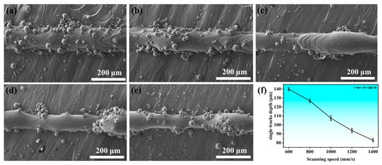 Single channel width at 160 W laser power for different scanning speeds: (a) V = 600 mm/s; (b) V = 800 mm/s; (c) V = 1000 mm/s; (d) V = 1200 mm/s; (e) V = 1400 mm/s; (f) the changing trend.