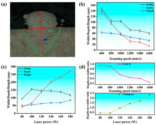 (a) Characteristic parameters of the molten pool; (b) measured depth, width and height of molten pools under various scanning speeds; (c) laser powers; (d) depth to width ratio of the molten pool.