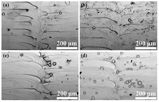 Following the analysis of single-track scanning, the parameter range for laser power and scanning speed was identified, and the study then focused on the forming quality at the single-layer level, where the periodic overlap between adjacent tracks becomes a critical factor. The overlap between two adjacent tracks, defined as the overlapping condition, significantly influences the surface quality of the single-layer forming. This is because the overlapping region between adjacent tracks undergoes multiple cycles of melting and solidification, leading to changes in the microstructure. The width of the single track varies with different laser energy inputs, which in turn affects the optimal laser hatch spacing required to form a smooth and flat surface. Therefore, under different combinations of laser power and scanning speed, the hatch spacing that achieves optimal surface quality varies. The overlap ratio between two adjacent tracks is negatively correlated with the hatch spacing; that is, for a given melt pool width, increasing the hatch spacing reduces the overlap ratio. Building upon the previous analysis of single-track morphology and molten pool geometry, an optimal parameter combination (P = 100 W, V = 1000 mm/s) that produced continuous tracks and favorable melt pools was selected to investigate. The effect of hatch spacing (30 μm, 45 μm, 60 μm, and 75 μm) on the surface morphology and defect evolution of single-layer multi-track specimens was systematically investigated, with the results shown in Figure 7.