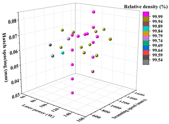 Based on the optimized process parameters from single-track cladding and single-layer scanning experiments, this study further investigated the synergistic regulatory mechanisms of laser power (60–140 W) and scanning speed (600–1400 mm/s) on the relative density of Ti65 alloy bulk samples through multi-layer multi-track experiments. As shown in Figure 8, under fixed parameters of hatch spacing (60 μm), the relative density of the formed samples exhibited significant nonlinear characteristics with variations in process parameters, ranging from 97.3% to 99.99%. Notably, several parameter combinations achieved densities above 99.99% due to the rounding in the plot legend, yet the combination of 100 W and 1000 mm/s consistently yielded the highest densification, approaching full theoretical density, indicating an optimal balance between molten pool dynamics and energy input efficiency.