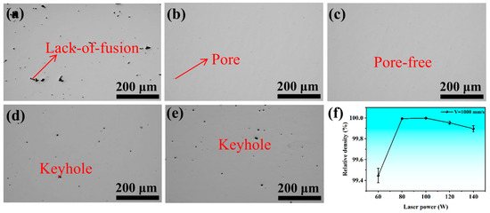 Relative density at 1000 mm/s scanning speed under different laser power: (a) P = 60 W; (b) P = 80 W; (c) P = 100 W; (d) P = 120 W; (e) P = 140 W; (f) the changing trend.