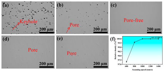 Relative density at 100 W laser power under different scanning velocities: (a) V = 600 mm/s; (b) V = 800 mm/s; (c) V = 1000 mm/s; (d) V = 1200 mm/s; (e) V = 1400 mm/s; (f) the changing trend.