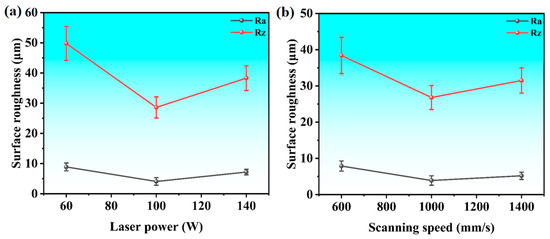 Side surface roughness Ra and Rz: (a) Effect of scanning power; (b) Effect of scanning speed.