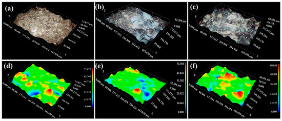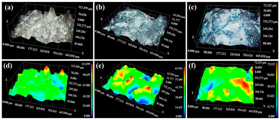 Under fixed parameters of scanning speed (1000 mm/s), hatch spacing (60 μm), the influence of laser power on surface roughness were investigated (Figure 11a). As the laser power increased from 60 W to 100 W, the Ra value sharply decreased from 8.9 ± 1.3 μm to 4.1 ± 1.2 μm, and the Rz value reduced from 49.8 ± 5.6 μm to 28.6 ± 3.5 μm, indicating that moderate energy input significantly improved track continuity (Figure 12b,e). Three-dimensional topography of the surface (Figure 12a,d) revealed that at a low power of 60 W, the tracks exhibited discrete sintering features with densely distributed lack-of-fusion powder and spheroidization defects, attributed to insufficient energy density-induced deterioration of molten pool wettability. When the power increased to 140 W, the Ra and Rz values rebounded to 7.2 ± 0.9 μm and 38.3 ± 4.1 μm, respectively (Figure 12c,f). The enlarged molten pool surface area and intensified turbulence of the liquid metal under high power exacerbated powder adhesion effects, while prolonged solidification time led to irregular expansion of track boundaries, thereby degrading surface flatness. This phenomenon corroborates the nonlinear coupling mechanism between energy density and molten pool dynamics: although increased power enhances penetration, excessive energy input destabilizes the surface tension-inertia force equilibrium, inducing molten pool instability. At a fixed laser power of 100 W, the surface roughness displayed a “V-shaped” distribution as the scanning speed increased (Figure 11b). As the speed changed from 600 mm/s to 1000 mm/s, the Ra value decreased from 7.9 ± 1.4 μm to 3.9 ± 1.3 μm, and the Rz value declined from 38.4 ± 4.9 μm to 26.8 ± 3.3 μm (Figure 13b,e). At low speed (600 mm/s), prolonged molten pool existence caused remelting and accumulation of overmelted metal droplets (Figure 13a,d), forming localized convex-concave structures. Conversely, at high speed (1400 mm/s), the abrupt reduction in energy density caused the molten pool cooling rate to exceed the critical threshold, disrupting track continuity (Figure 13c,f) and increasing surface roughness to Ra = 5.2 ± 1.1 μm. Notably, the inverse relationship between laser power and scanning speed highlights the dual-threshold sensitivity of surface roughness to energy input. The surface roughness of Ti65 alloy is synergistically controlled by laser power and scanning speed, with extremum points corresponding to the dynamic equilibrium between energy density thresholds and molten pool stability. Moderate energy input ensures complete melting and uniform spreading of metal powder, forming a smooth surface. In contrast, insufficient or excessive energy inputs result in lack-of-fusion defects or overmelting, respectively, thereby increasing surface roughness.