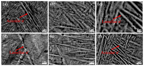 Under fixed scanning speed (1000 mm/s) and hatch spacing (60 μm), the microstructure exhibited significant variations with changes in laser power. At a low laser power of 60 W (Figure 14a), the relatively low molten pool temperature and shallow penetration depth resulted in a microstructure dominated by fine acicular α′ grains. As the laser power increased to 100 W (Figure 14b), martensitic transformation occurred, yielding a hybrid microstructure comprising fine acicular α′-martensite and coarse lamellar α′-martensite. The acicular morphology originates from the non-diffusional shear transformation under high cooling rates, whereas the coarser lamellar structure is associated with the coarsening of α′ phase due to local thermal cycles within the melt pool. Further increasing the power to 140 W (Figure 14c) enlarged the dimensions of the martensitic α′-phase. Quantitative analysis of grain width, as summarized in Figure 15, revealed an increasing trend from 0.236 ± 0.049 μm at 60 W to 0.525 ± 0.042 μm at 140 W. This phenomenon is attributed to the limited energy input at lower power, which promotes the formation of distinct grain boundaries. In contrast, higher power elevates molten pool temperature and penetration depth, enabling remelting of fine grains and their subsequent coarsening. At a fixed laser power of 100 W and hatch spacing of 60 μm, variations in scanning speed also exerted pronounced effects on the microstructure, as further illustrated in Figure 15. At a low scanning speed of 600 mm/s (Figure 14d), the relatively high energy input facilitated the formation of coarse α′-phase with a width of 0.645 ± 0.012 μm. Conversely, increasing the scanning speed to 1400 mm/s (Figure 14f) refined the microstructure, yielding slender acicular α′-phase grains with reduced widths (0.274 ± 0.025 μm). Fundamentally, lower laser power or higher scanning speeds reduce energy density, accelerating cooling rates. This rapid cooling promotes the nucleation of fine acicular α′-phase clusters along grain boundaries, constrained by boundary interactions [32]. Conversely, higher laser power or lower scanning speeds prolong the cooling period from the β-phase to the α′ + β two-phase region, allowing dislocations and defects within grains to act as high-energy sites for the growth of coarse lamellar α′-phase. In summary, energy input density governs the microstructural characteristics of LPBF-fabricated Ti65 alloy. By precisely controlling laser power and scanning speed, the morphology and dimensions of grains can be effectively tailored, enabling optimization of material performance while maintaining high densification.