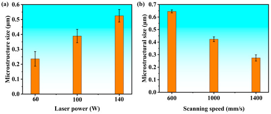 Microstructural dimensions of α′ phase at different laser powers (a) and scanning speeds (b).