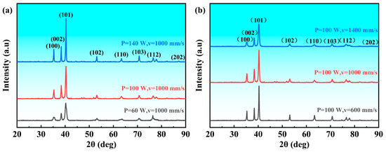 XRD analysis of the LPBF processed samples with variations in laser power (a) and scanning speed (b).