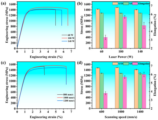 Mechanical properties of specimens under different process parameters: (a,c) engineering stress strain curves; (b,d) tensile performance data.