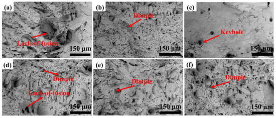 When the laser power increases to 140 W (scanning speed: 1000 mm/s), the UTS further declines to 1407 ± 11.1 MPa, accompanied by a reduced elongation of 4.7 ± 0.36%. This decline is associated with keyhole porosity and coarsened α′-martensite resulting from excessive energy input which reduces the effective load-bearing area and facilitates crack propagation. The fracture morphologies in Figure 18 provide further insights into deformation and failure mechanisms. For specimens fabricated at 60 W (Figure 18a), the fracture surface displays numerous lack-of-fusion regions, where cracks propagate along defect interfaces, exhibiting quasi-cleavage fracture characteristics. This correlates with the low elongation observed in tensile tests. In contrast, specimens processed under optimal parameters (100 W, 1000 mm/s) exhibit densely distributed dimples (Figure 18b), indicative of ductile fracture via microvoid coalescence, which aligns with their high elongation and uniform microstructure. However, at 140 W (Figure 18c), fine keyhole pores act as crack initiation sites, accelerating fracture and reducing ductility [47]. Scanning speed also exerts a notable influence: At 600 mm/s (Figure 18d), the fracture surface exhibits a mixed morphology of lack-of-fusion regions and dimples, suggesting a transition between brittle and ductile failure modes. As the speed increases to 1400 mm/s (Figure 18f), the dimple density rises, reflecting enhanced ductility due to refined grain structures.
