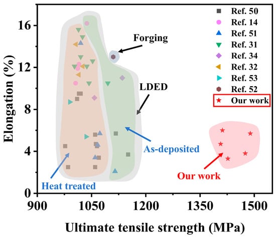 The mechanical properties of the as-fabricated Ti65 samples are predominantly determined by the resultant microstructure and achieved relative density. The optimized sample, characterized by near-full densification and a refined mixture of acicular α′-martensite, exhibits a superior combination of ultimate tensile strength and microhardness. This enhancement is primarily attributed to a composite strengthening mechanism, involving grain refinement and phase transformation strengthening. Figure 19 illustrates a schematic comparison of the mechanical properties of Ti65 alloy in the as-deposited and heat-treated conditions produced by different processes, including forging, LDED, and LPBF [14,31,32,34,50,51,52,53]. It can be observed that the Ti65 alloy fabricated by LPBF exhibits significantly higher tensile strength approximately 1.5 times that of samples produced by forging and LDED. This enhancement is primarily attributed to the markedly refined grain structure resulting from the extremely high cooling rates inherent to the LPBF process.
