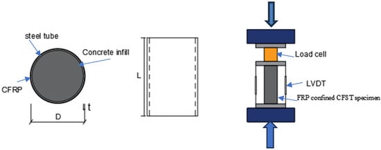 Concrete-filled steel tube (CFST) columns have become a feasible structural component in civil engineering due to their exceptional strength, flexibility, and fire resistance. These columns include a steel tube enclosing concrete. The steel provides substantial tensile strength to the concrete, ensuring its stability, while the concrete core endures compression forces and inhibits local buckling of the steel tube []. This synergy enhances structural efficiency, particularly in compression members, resulting in the growing use of CFST columns in high-rise buildings, bridges, and other infrastructure projects []. This study addresses the scientific problem of systematically understanding how fiber reinforced polymer (FRP) confinement, in conjunction with variations in steel tube thickness, concrete strength, and fiber additives such as silica fume and polypropylene, influences the axial load behavior, ductility, and failure mechanisms of CFST columns. Notwithstanding prior studies on the advantages of confinement, substantial deficiencies persist in thoroughly quantifying these effects under regulated experimental settings, including failure modes and post-peak behavior [].