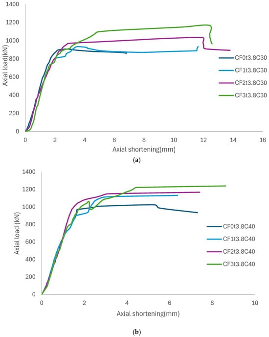 Examples of axial load vs. axial shortening curves for CFST specimens with different FRP layers (tube thickness of 3.8 mm and infill concrete strength of (a) 30 MPa and (b) 40 MPa).
