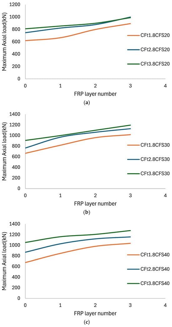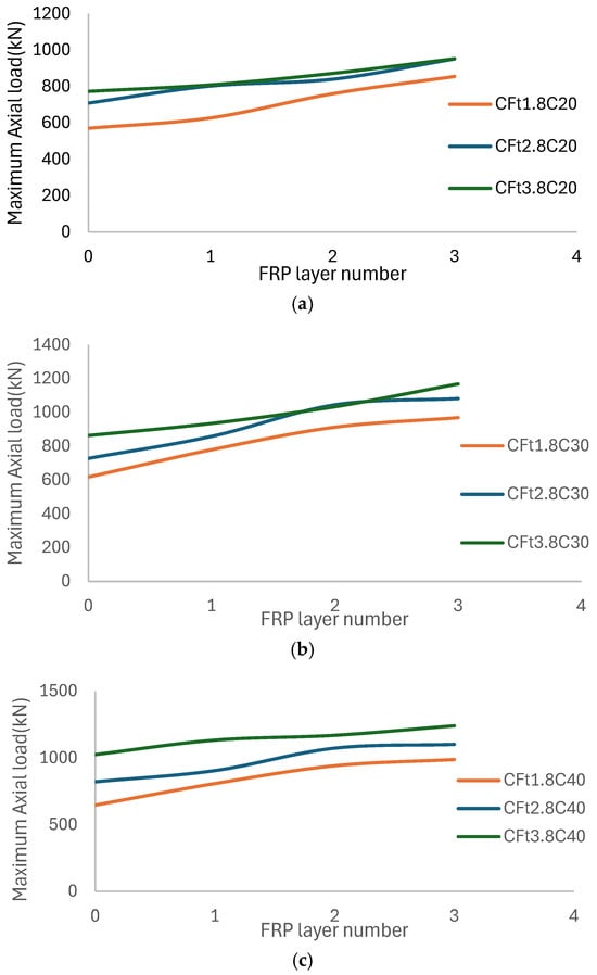 Effect of the number of FRP layers on the maximum axial load capacity of CFST with different steel tube thicknesses and concrete strengths (without silica powder and polypropylene fiber), (a) concrete strength 20 Mpa, (b) concrete strength 30 Mpa, (c) concrete strength 40 Mpa.