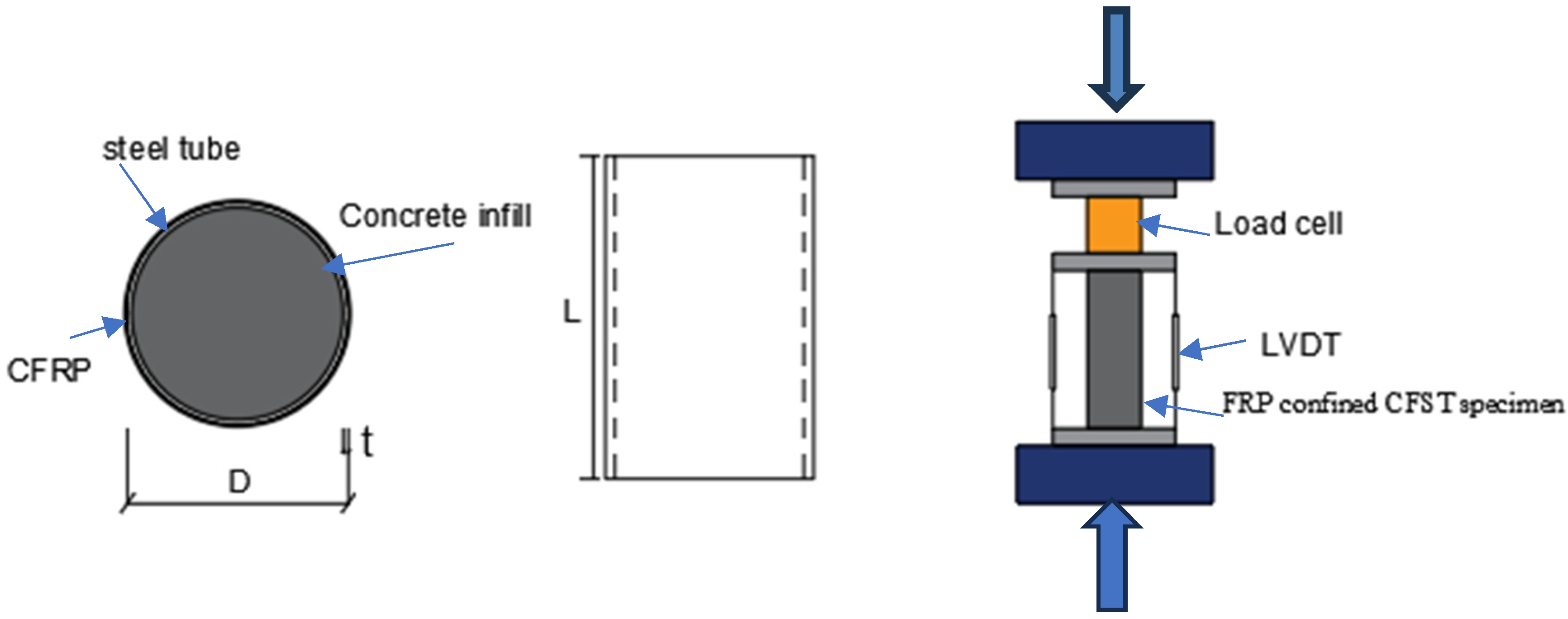 | Specimens | L (mm) | D (mm) | FRP | nf | ts (mm) | tf (mm) | fy (MPa) | fc (MPa) |