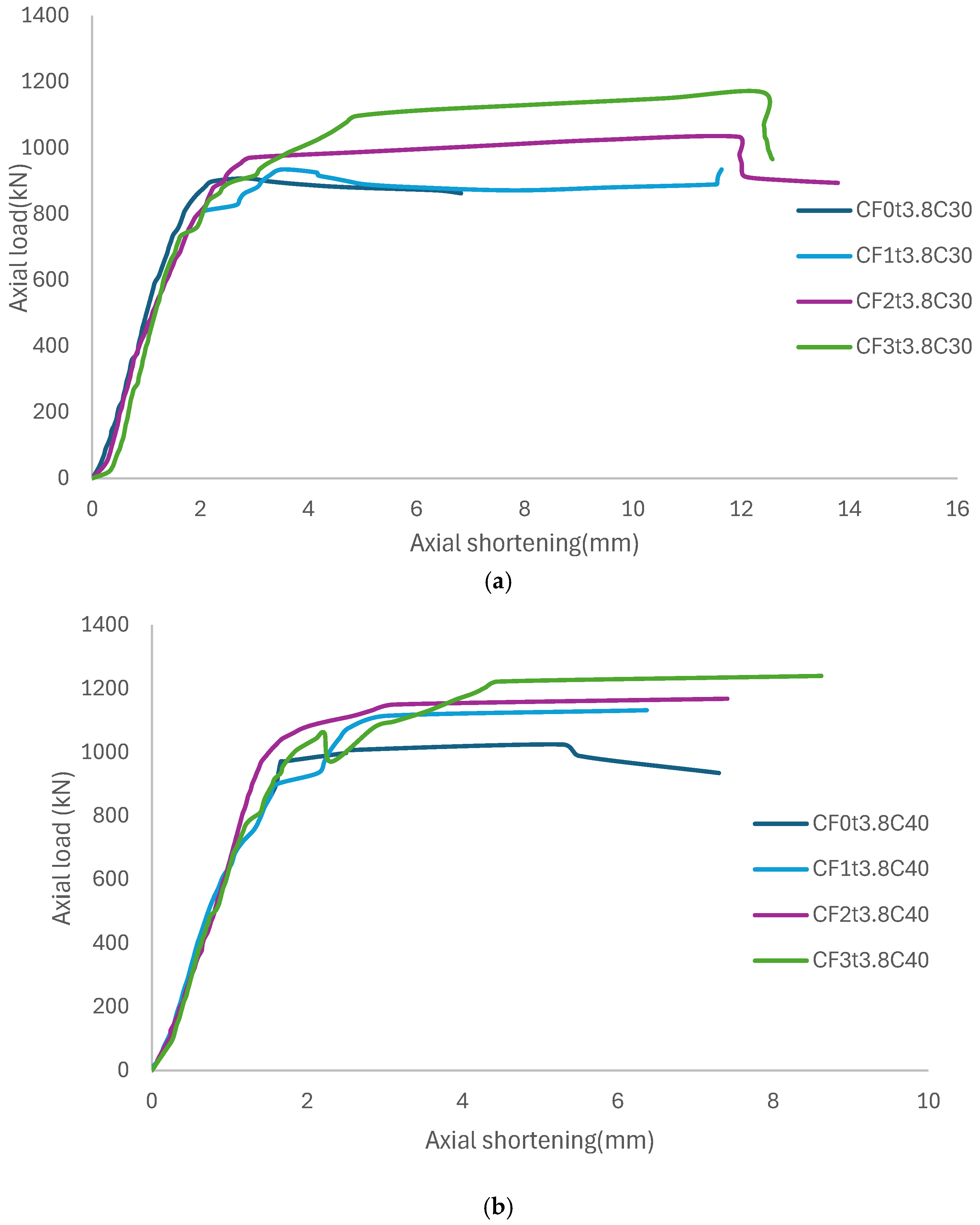 - Lu, Y.; Li, N.; Li, S.; Liang, H. Behavior of steel fiber reinforced concrete-filled steel tube columns under axial compression. Constr. Build. Mater. 2015, 95, 74–85. [Google Scholar] [CrossRef]
