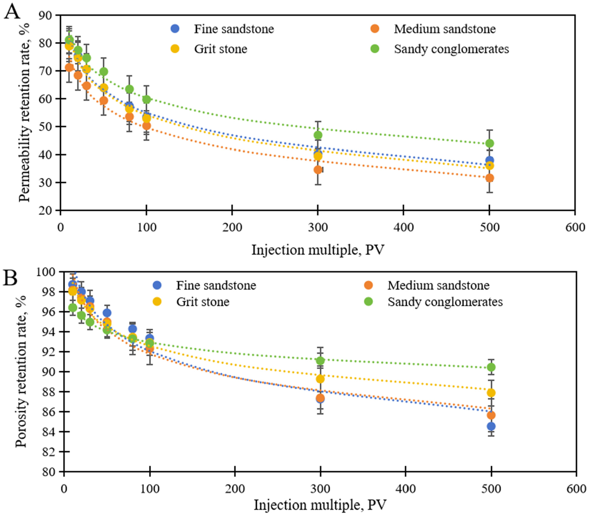 Water sensitivity experiments were conducted on conglomerate, coarse sandstone, medium sandstone, and fine sandstone from the North 31 area to investigate the changes in porosity and permeability under different injected pore volumes (PV). Overall, permeability decreased significantly with increasing injected PV. When PV ≤ 100, permeability experienced a rapid reduction; beyond 100 PV, the decline tended to stabilize. The conglomerate, with higher reservoir quality, exhibited the highest permeability retention under the same injected PV, while medium sandstone, containing more clay, showed the lowest retention. Coarse and fine sandstones displayed similar retention behaviors (