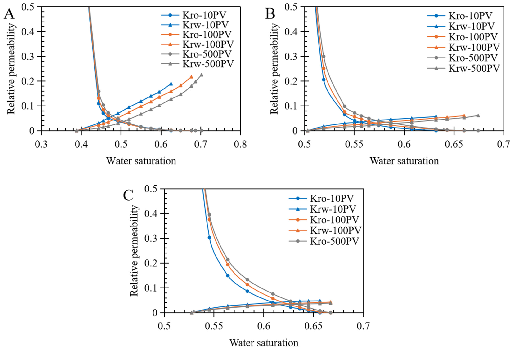 Figure 4A), with increasing waterflooding multiples, the oil and water phase flow capacities exhibit a trend of coordinated improvement. The oil-phase relative permeability curve shifts significantly to the right, and the water saturation corresponding to the equal-permeability point increases markedly, while the water-phase relative permeability shows a steady increase. This indicates that during long-term waterflooding, the conglomerate reservoir primarily undergoes optimization and modification of pore structure. The coarse-grained skeleton provides good stability, allowing the reservoir to withstand strong fluid scouring. Consequently, the two-phase flow interval broadens, residual oil saturation decreases, and the reservoir demonstrates good development potential.