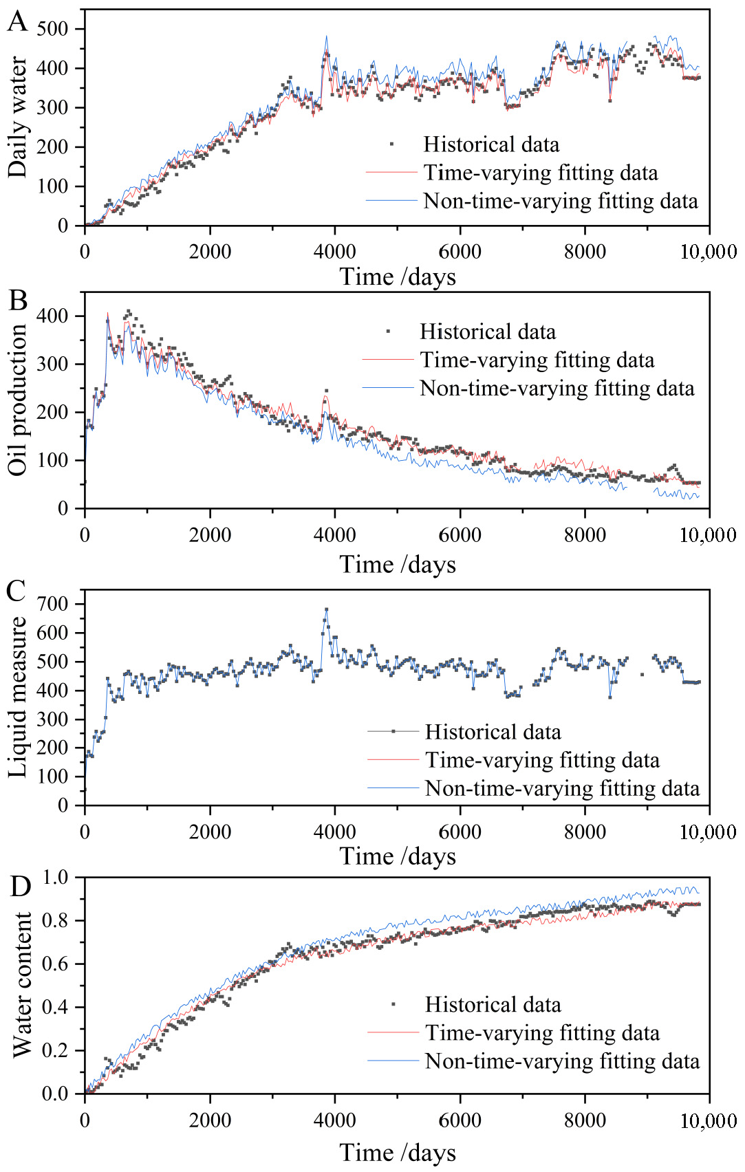 Figure 9). These results indicate that the time-variant model effectively captures the dynamic reservoir behavior during long-term water injection, particularly providing high-fidelity simulation of water cut and pressure during the high water cut stage.