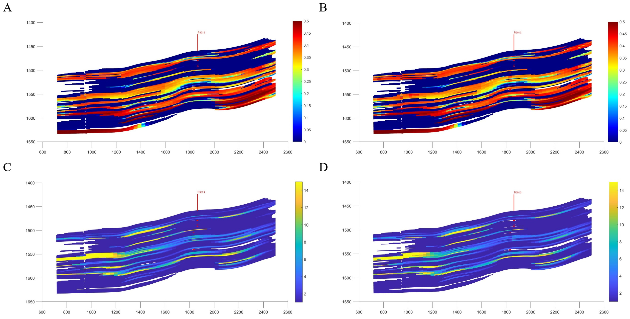 Considering time-variant effects during reservoir development is crucial for understanding reservoir characteristics and the distribution of residual oil. Studies indicate that when time-variant factors are incorporated, the overall reservoir permeability tends to decline, while local residual oil saturation correspondingly increases. For instance, in wells B3013 and B2033IW, planar and cross-sectional residual oil maps clearly show that the combined effect of strong water sensitivity and high-rate water injection leads to attenuation of the permeability in preferential flow channels. Consequently, residual oil predominantly accumulates in low-permeability zones and non-mainstream regions (see