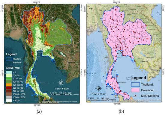 Study boundary: (a) Thailand boundary and meteorological station points, and (b) Digital Elevation Model (DEM) of Thailand (applied from USGS Earth Explorer; source: https://earthexplorer.usgs.gov/ (accessed on 13 September 2024).