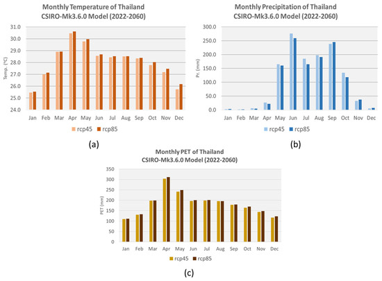 Monthly climate components and characteristics in time series during the mid-21st century period of Thailand: (a) Temperature, (b) rainfall, and (c) potential evapotranspiration (PET).