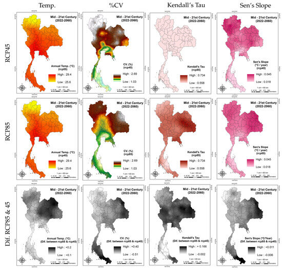 Phumkokrux and Trivej (2024) [28] observed similar spatial temperature patterns in Thailand during 1987–2021 compared to projections for 2022–2060 under both scenarios. However, projected mid-century temperatures were significantly higher, indicating a warmer future for the country [28].