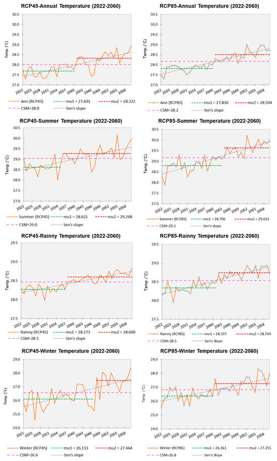 Temperature changes through the period (orange line); CSM (pink line); CSM before and after abrupt change (green and red lines); and Sen’s slope value (black line) for RCP45 and RCP85.