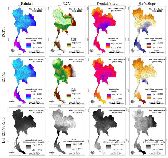 Figure 5 shows the spatial distribution of annual Sen’s slope and Kendall’s tau for rainfall in Thailand. Under RCP4.5, increasing trends predominated at higher longitudes, especially the eastern and southern regions, with a statistically significant Kendall’s tau of 0.263 (p = 0.019). Under RCP8.5, Kendall’s tau was positive (0.163) but not significant (p = 0.147), notably in the southern region. This suggests weak rainfall increases with high variability under extreme scenarios like RCP8.5, likely due to complex atmospheric circulation changes affecting tropical monsoon systems [86,93,94]. Such variability causes irregular seasonal rainfall shifts, making long-term trends hard to detect, consistent with findings in strong monsoon regions [95]. Figure 6 shows increasing rates (mm/year) under RCP4.5 as +0.807 (summer), +5.721 (rainy), –1.259 (winter), and +5.334 (annual); and under RCP8.5 as +1.338, +1.283, +0.715, and +4.715, respectively. Rates under RCP8.5 were generally lower than those under RCP4.5, reflecting nonlinear, region-specific climate responses influenced by monsoon dynamics, ocean–atmosphere interactions, and topography [86,93,96]. Thus, rainfall increases under RCP8.5 are not necessarily greater than under RCP4.5.