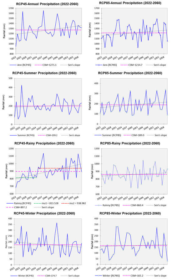 Rainfall throughout the period (blue line); CSM (pink line); CSM before and after abrupt change (green and red lines); and Sen’s slope value (black line) for RCP45 and RCP85.