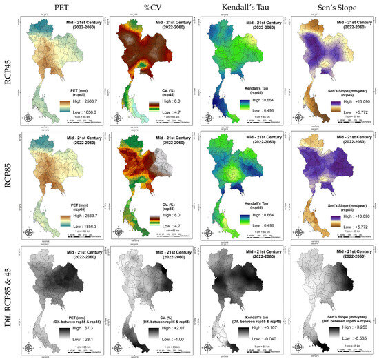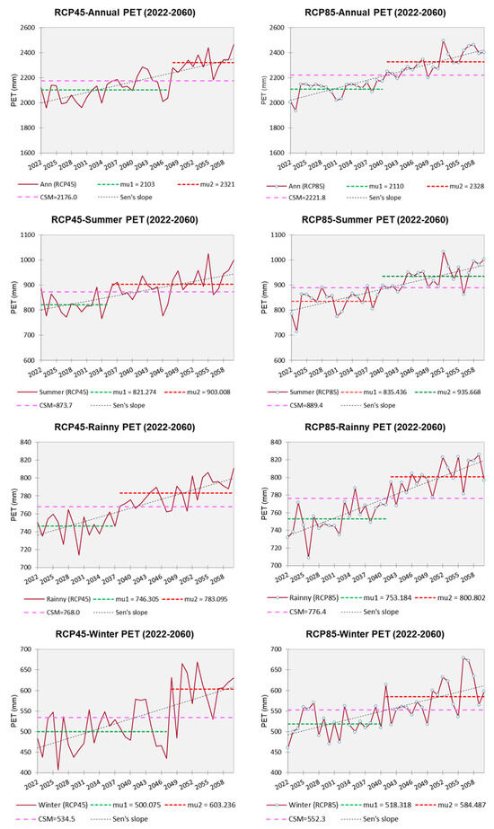 Potential evapotranspiration (PET) was calculated using Equation (14) based on temperature and rainfall from the CSIRO-Mk3 dataset’s RCP4.5 and RCP8.5 scenarios. Data for all 104 meteorological stations in Thailand were generated by the SD-GCM Version 2 tool with EQM downscaling [67]. Annual PET ranged from 1034.9 to 2783.5 mm (mean 2176.0 mm) under RCP4.5, and 1049.0 to 2848.7 mm (mean 2221.8 mm) under RCP8.5. Monthly PET, shown in Figure 2, rose from January, peaked in April, then declined and stabilized during the rainy season, dropping sharply in winter, mirroring temperature trends. PET values were consistently slightly higher under RCP8.5. Spatial PET patterns (Figure 7) were similar between scenarios, though drier areas were more extensive under RCP8.5, especially in the northeast and central regions near Bangkok, with lowest PET in the north, which is consistent with the temperature distribution. Cumulative seasonal means (CSMs) of PET (Figure 8) were 873.7 mm (summer), 768.0 mm (rainy), 534.5 mm (winter), and 2176.0 mm (annual) for RCP4.5, and 889.4, 776.4, 552.3, and 2221.8 mm, respectively, for RCP8.5. Pettitt’s test (95% significance) showed statistically significant abrupt change points (p < 0.0001) at all stations for annual PET under both scenarios. Change points occurred around 2035 (summer), 2037 (rainy), 2047 (winter), and 2047 (annual) for RCP4.5, and 2039, 2041, 2040, and 2040, respectively, for RCP8.5.