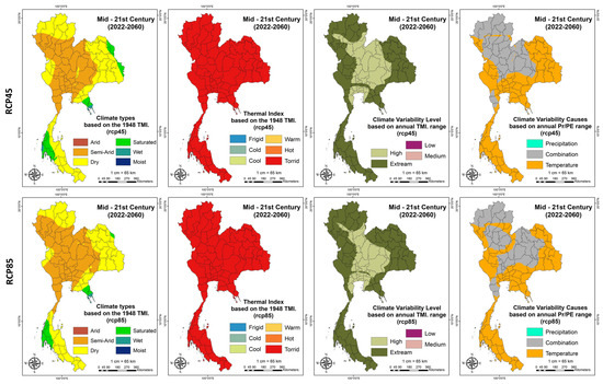 The New Thornthwaite Climate Classification prediction is classified using only air temperature (°C), rainfall (mm), and PET (mm) over the mid-21st century period (2022–2060), and these factors were simulated by the best selected CMIP5 model with appropriate statistical downscaling of the same 104 meteorological station locations covering Thailand, as shown in Figure 1b.